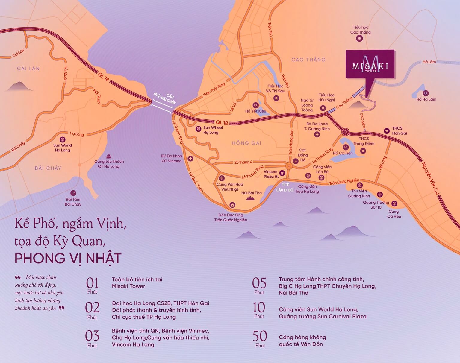 Sở hữu tọa độ vị trí vàng, ngay trung tâm thành phố cùng tầm nhìn “đắt giá” ra Vịnh Hạ Long, Misaki Ha Long mang trong mình một phong cách sống “tối giản” như chính nét đặc trưng của xứ Phù Tang – Nhật Bản. Với vị trí trung tâm, Misaki Ha Long giúp cư dân có thể dễ dàng kết nối thuận tiện tới các khu vực trọng điểm tại TP Hạ Long và các TP, huyện, thị xã lân cận tại tỉnh để đáp ứng nhu cầu một cách nhanh chóng nhất.